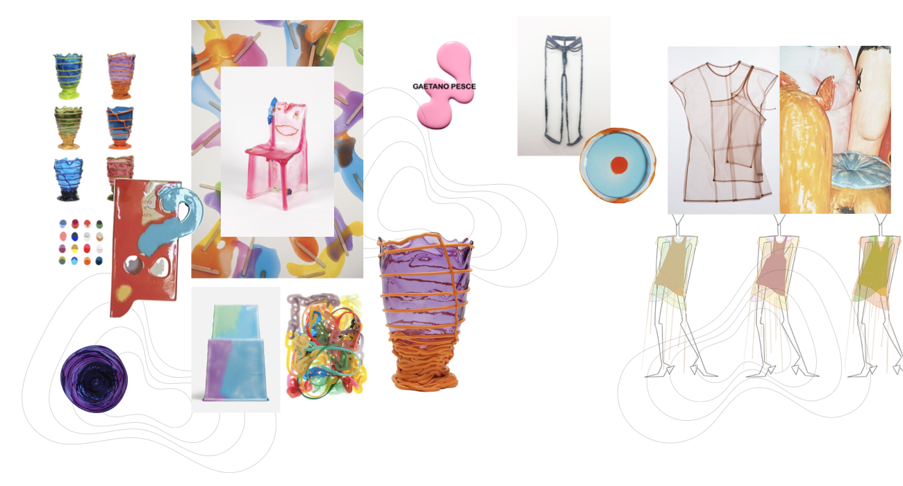 The looks are inspired by the art of Gaetano Pesce, particularly the 'Fish Design Studio' collection, a series of silicone vases crafted by Italian artisans.